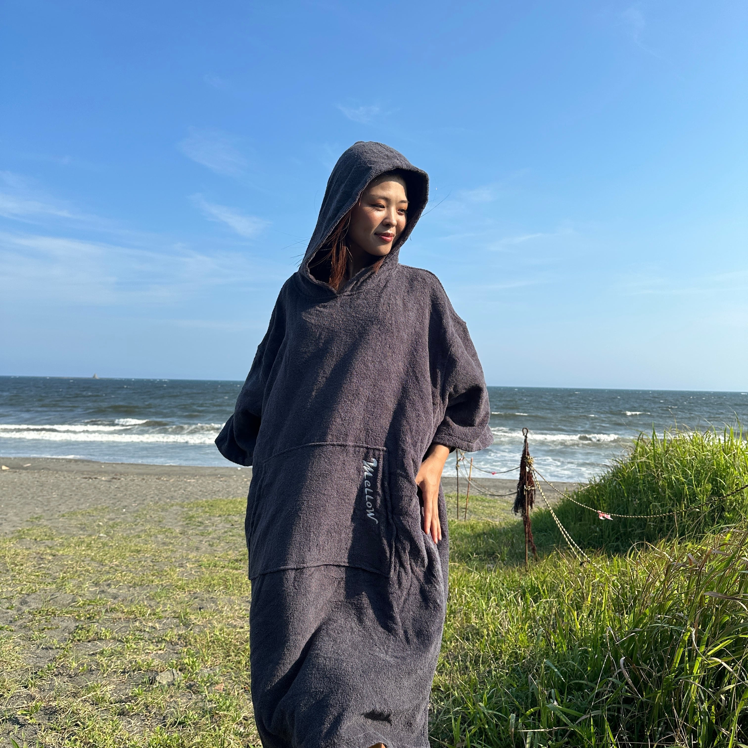 サーフィンやビーチでのお着替えに最適なこのポンチョは、コットン100%の素材を使用しており、肌触りが非常に良く、リラックスした気持ちで素早く着替えることができます。サイズはフリーサイズなので、体型を問わず誰でも気軽に着用できるのも大きな魅力です。