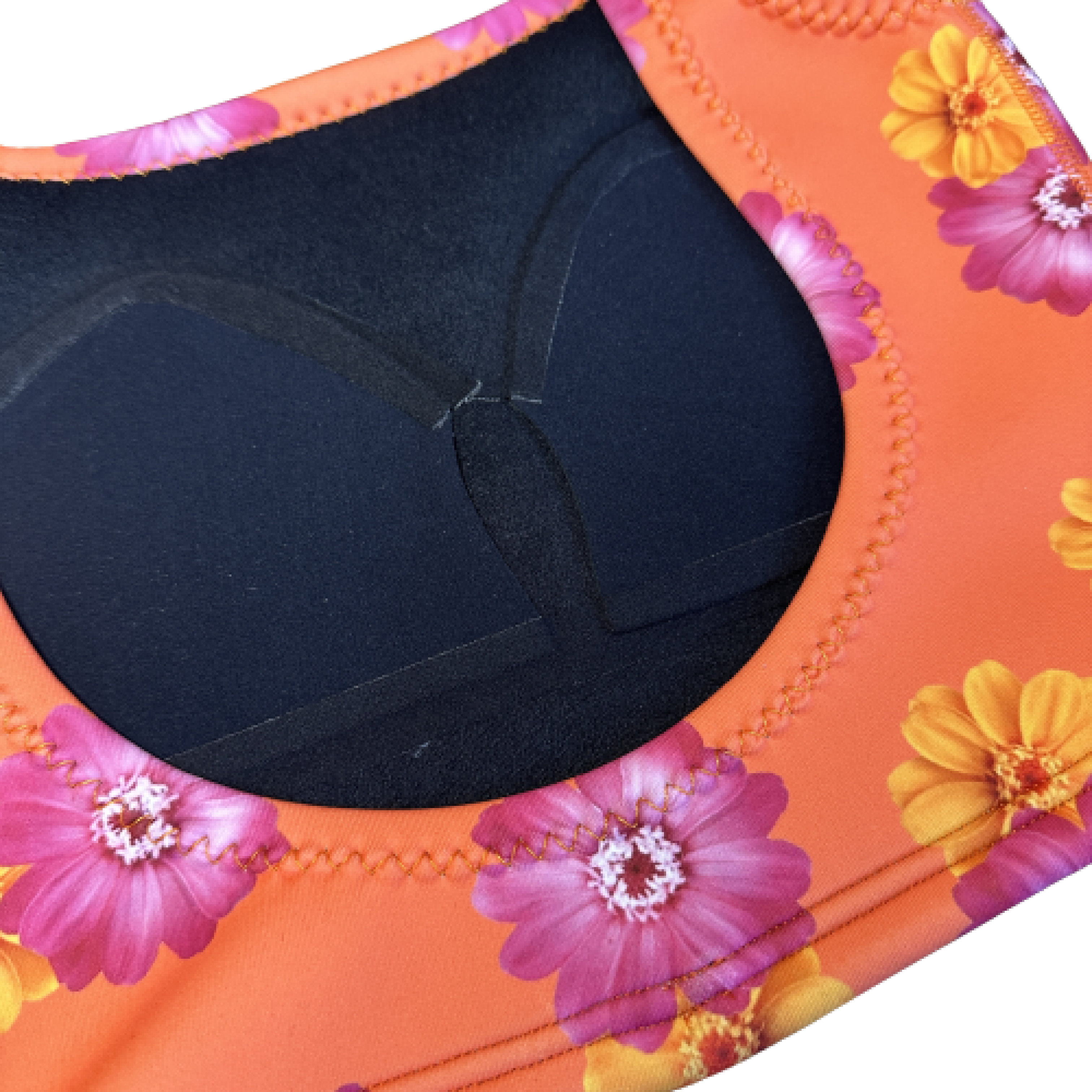 ウェットスーツ素材で作られたキャミタイプの水着〈tops〉。サーフィンやビーチでのアクティビティ中でもズレる心配がなく、安心してお楽しみいただけます。